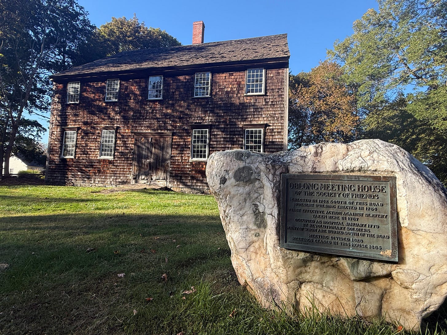 It was in 1767 at the Oblong Meeting House in Quaker Hill that the “first formal and effective action by an organized group in the United States to halt slavery” took place.1 That’s what the plaque says, anyway. The local Society of Friends passed a resolution declaring that slavery was inconsistent with Christianity. The resolution worked its way through the Quaker governance structure of monthly, quarterly, and yearly meetings before being formally adopted a few years later. By 1776, Quakers in the American colonies were prohibited from owning slaves.2 The Emancipation Proclamation would follow nine decades later.